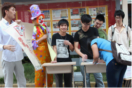 9月19日下午4:00,在團(tuán)委學(xué)生會(huì)社會(huì)實(shí)踐部的組織下,我校文學(xué)社、籃球社、街舞社等十八個(gè)社團(tuán)在宣傳欄前擺攤招新。