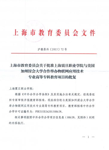 在全球經(jīng)濟(jì)一體化、科技與信息迅速發(fā)展的今天,國(guó)際化已經(jīng)成為教育發(fā)展的趨勢(shì),也是我院職業(yè)教育適應(yīng)經(jīng)濟(jì)發(fā)展和國(guó)家“走出去”發(fā)展戰(zhàn)略的必然選擇。我院在董事長(zhǎng)、院長(zhǎng)和黨委書(shū)記的領(lǐng)導(dǎo)下,經(jīng)過(guò)杜飛龍?jiān)洪L(zhǎng)具體指導(dǎo)和機(jī)電工程學(xué)院、國(guó)際交流處等有關(guān)部門(mén)領(lǐng)導(dǎo)和同仁的努力,積極申報(bào)上海震旦職業(yè)學(xué)院與美國(guó)加州浸會(huì)大學(xué)合作舉辦物聯(lián)網(wǎng)應(yīng)用技術(shù)專(zhuān)業(yè)高等專(zhuān)科教育項(xiàng)目。在申報(bào)過(guò)程中學(xué)習(xí)其他高校辦學(xué)經(jīng)驗(yàn),與浸會(huì)大學(xué)溝通聯(lián)系,反復(fù)修改項(xiàng)目方案,終于在 2015年9月30日獲上海市教育委員會(huì)批準(zhǔn)和教育部核準(zhǔn)。中外合作辦學(xué)許可證編號(hào)為:PDE31US3A20150863N。
