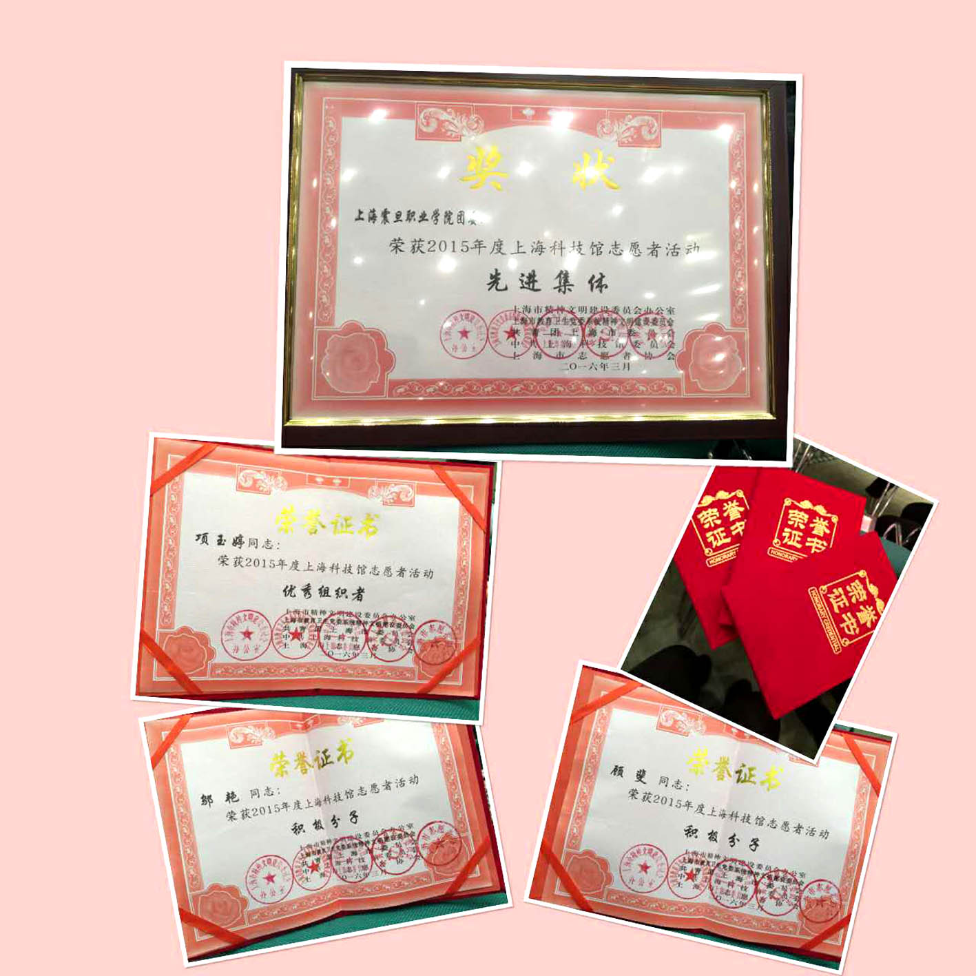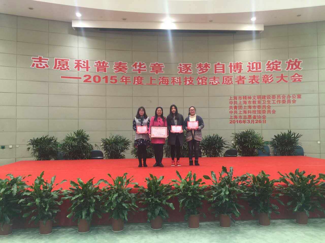 表彰會(huì)上,我校團(tuán)委被授予“2015年度上??萍拣^志愿者活動(dòng)先進(jìn)集體”,項(xiàng)玉婷同學(xué)被授予“2015年度上??萍拣^志愿者活動(dòng)優(yōu)秀組織者”稱號(hào),社會(huì)實(shí)踐部鄔艷同學(xué)、學(xué)習(xí)部顧斐同學(xué)被授予“2015年度上??萍拣^志愿者活動(dòng)積極分子”稱號(hào)。