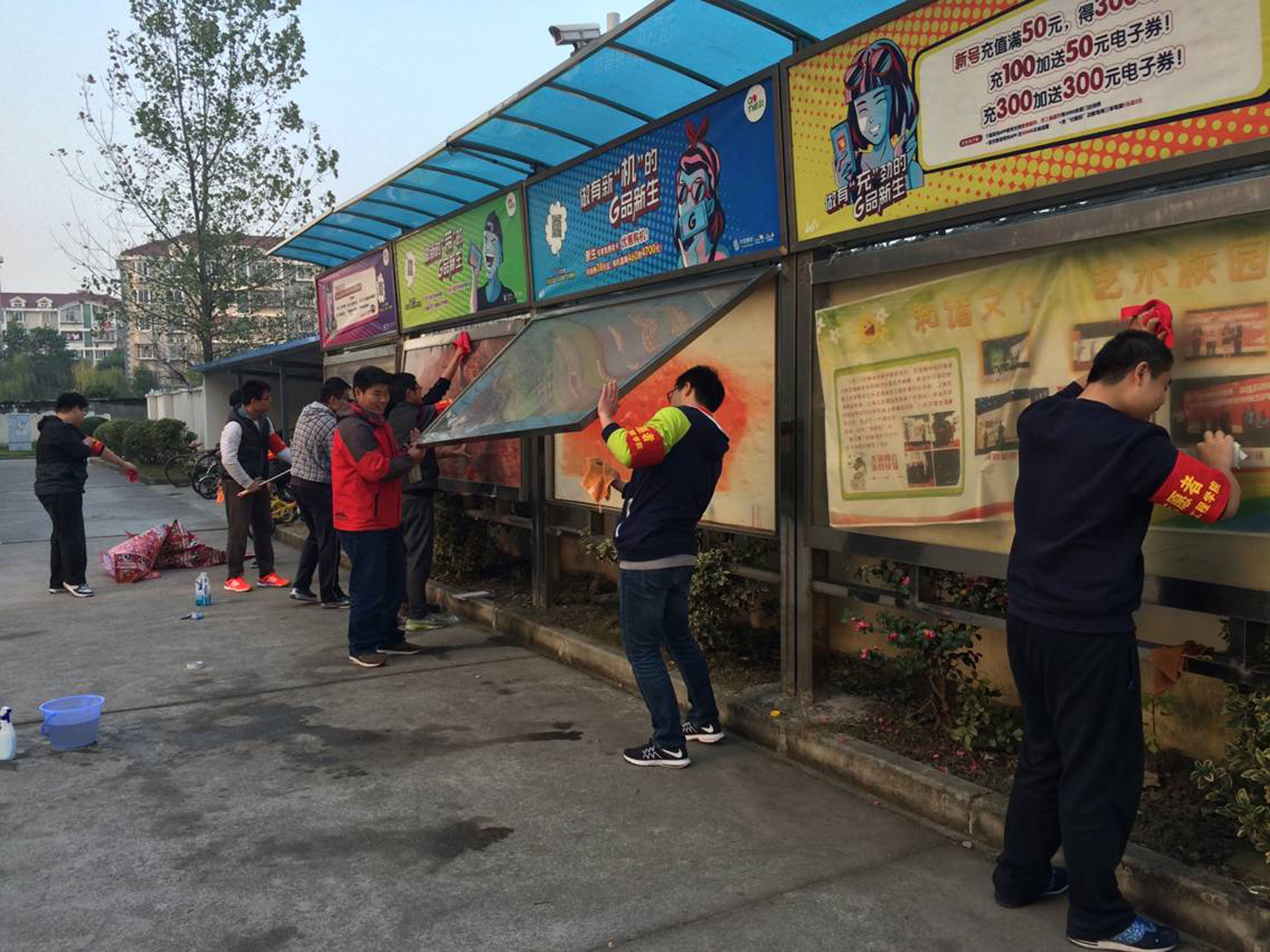 在打掃前,為保護(hù)校園櫥窗內(nèi)的宣傳海報(bào),同學(xué)們特地鋪了一層自己制作的防水層。打掃的過(guò)程中,同學(xué)們有序分工、齊心協(xié)力認(rèn)真負(fù)責(zé)的一遍遍擦拭著布滿灰塵的校園宣傳櫥窗。期間也發(fā)生了一些小插曲,雖然同學(xué)們?cè)谑虑岸假N出告示,告知各位車主有打掃活動(dòng)請(qǐng)不要把車輛??吭跈淮芭?,可還是有車主將愛(ài)車停在了校園宣傳櫥窗前,導(dǎo)致我們的同學(xué)不能清掃被阻擋的三塊櫥窗。
