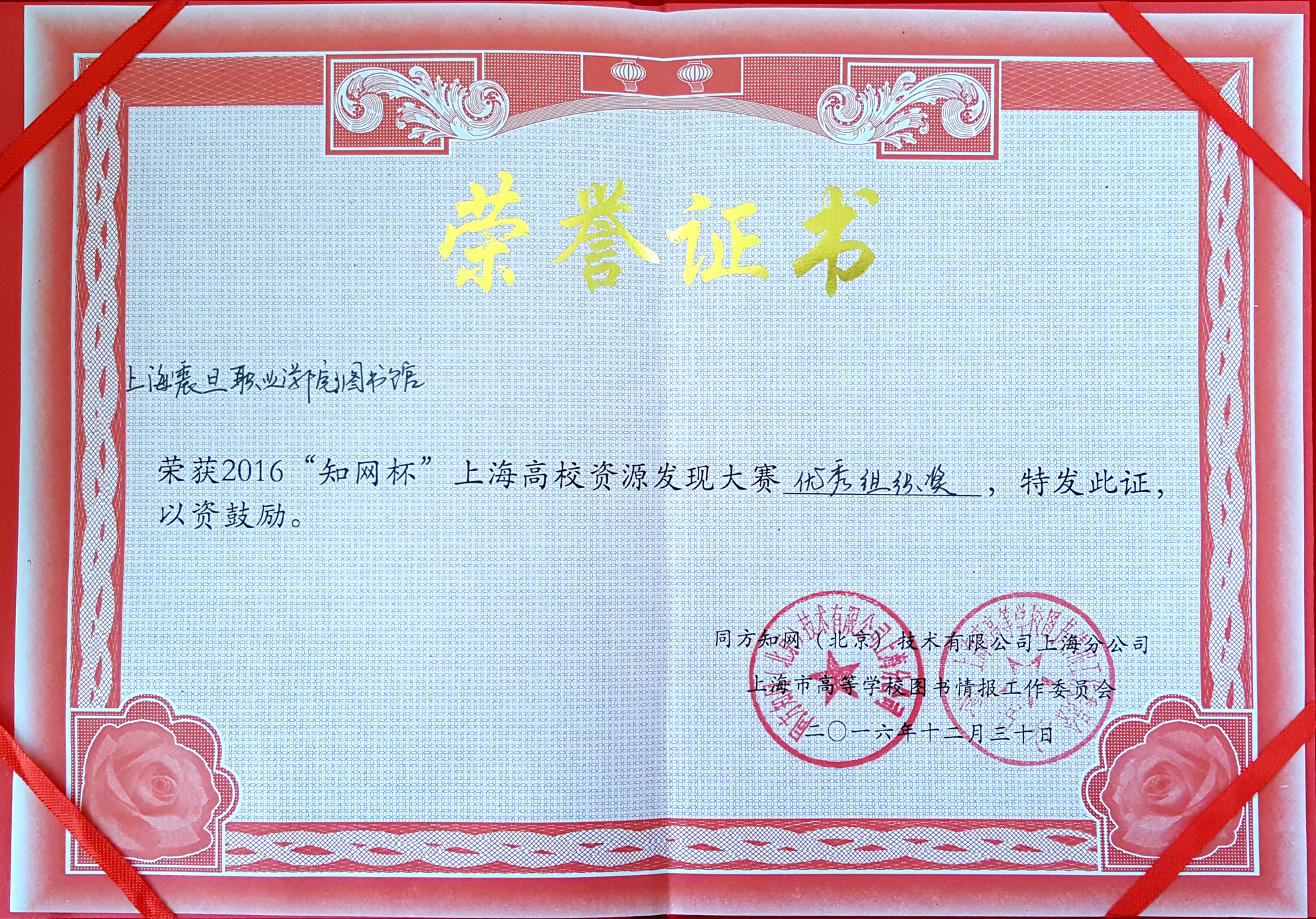 圖書館榮獲2016“知網(wǎng)杯”資源發(fā)現(xiàn)大賽優(yōu)秀組織獎
