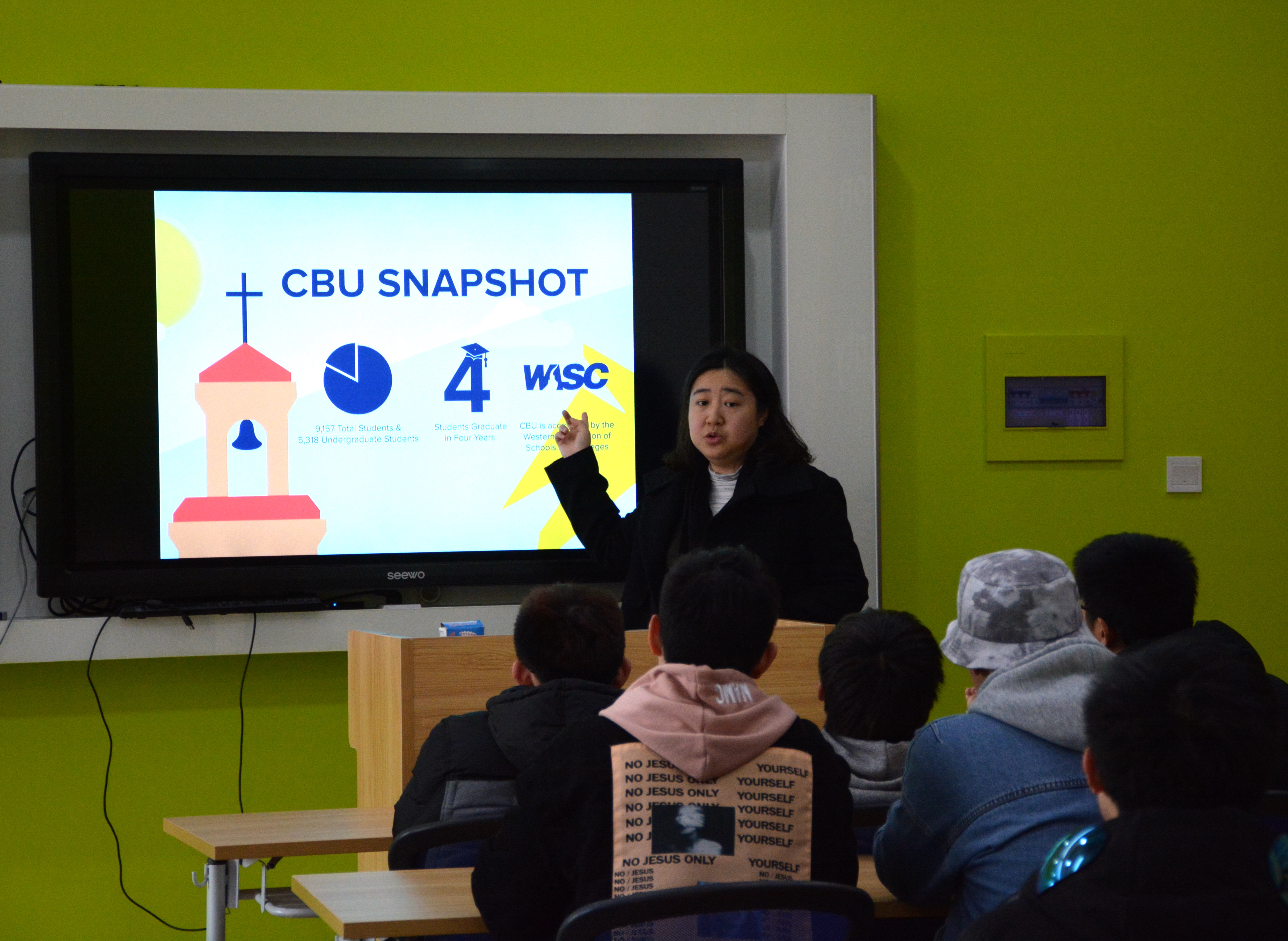 Vicky首先用動畫剪影片段詳細介紹CBU情況:學校一流的學術(shù)建設(shè),為畢業(yè)生提供推薦進企業(yè)的機會;安全優(yōu)美的校園環(huán)境及高質(zhì)量的校園生活;豐厚的獎學金制度以及入學CBU的成績要求等等。Vicky老師還介紹CBU周圍著名景點,如好萊塢、迪士尼、LagunaBeach等。在Q&A環(huán)節(jié),針對學生們提出的問題,入學學費問題、語言問題、生活環(huán)境問題、課余兼職問題、畢業(yè)證書問題等,Vicky一一作出解答。Vicky還為同學帶來精美禮物,印有學校LOGO的T恤和解壓橙子,在與學生互動解答時分發(fā)給學生。