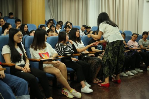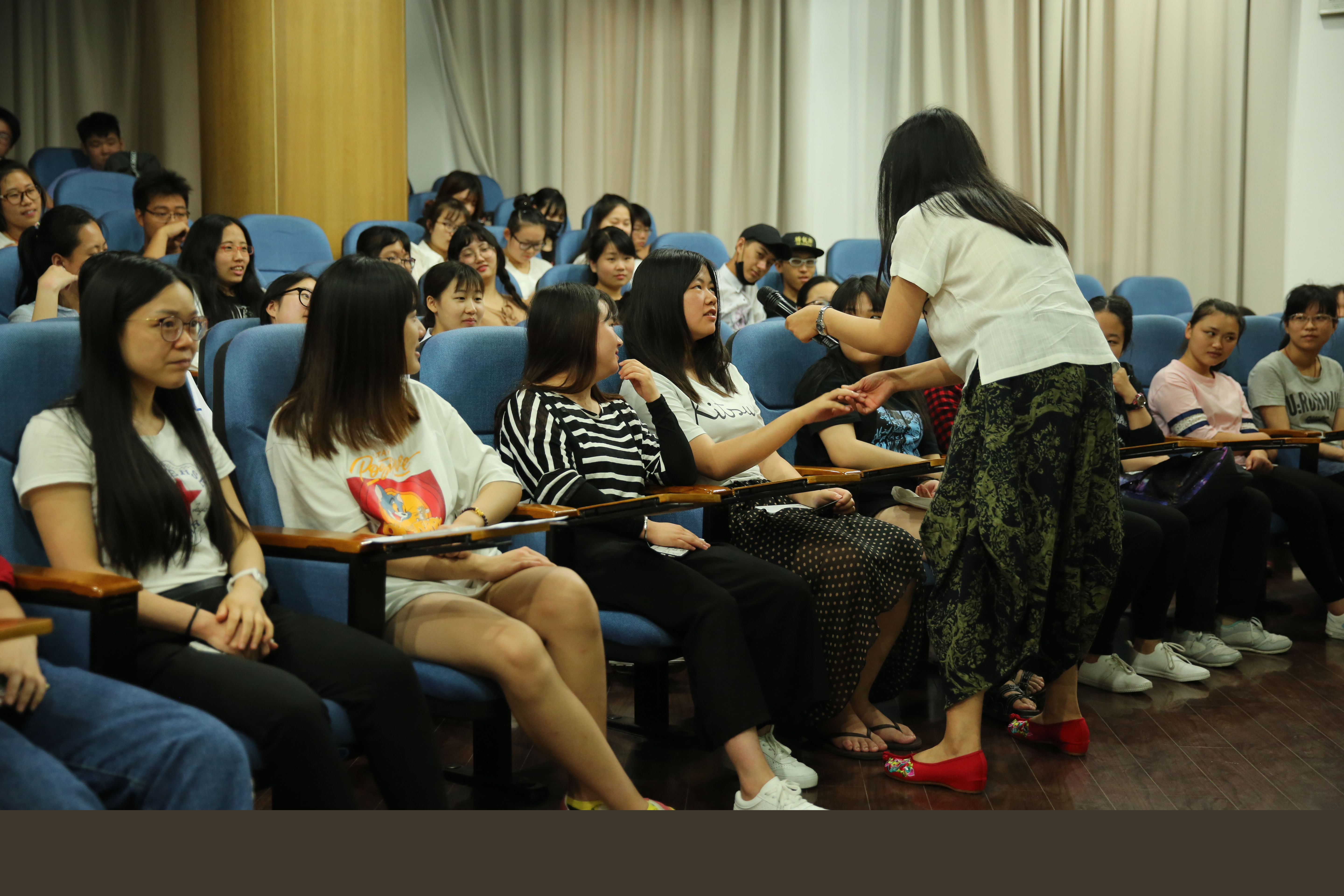 音樂(lè)可以激活潛意識(shí),影響情緒。李老師分別播放了悲傷、歡快、恐懼和激昂的音樂(lè)片段使同學(xué)們感受音樂(lè)的感染力。用擊鼓傳花的方式選出8位同學(xué)上臺(tái)表演“鼓點(diǎn)行走”,同學(xué)們隨著非洲鼓鼓點(diǎn)行走在臺(tái)上,時(shí)而緩慢,時(shí)而歡快。小游戲“下雨咯”使同學(xué)們?nèi)橥度?,小雨(彈舌),中雨(拍腿),大雨(跺腳),同學(xué)們跟著老師講述的故事配合著“下雨”?!安ɡ藗鬟f游戲”將整個(gè)講座的氣氛推向高潮。李老師強(qiáng)調(diào)肢體接觸可以有利于快速建立關(guān)系。隨著“音樂(lè)回聲游戲”、“再見(jiàn)歌曲”整個(gè)講座接近尾聲。