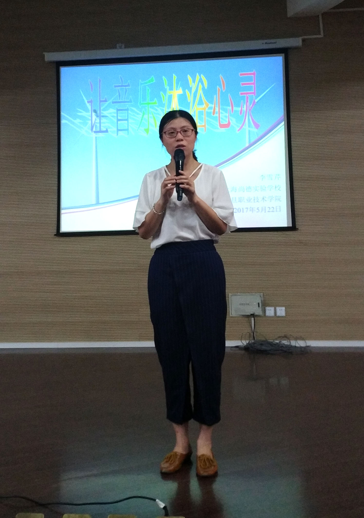 上海震旦職業(yè)學(xué)院2017年度大學(xué)生心理健康教育活動(dòng)月系列講座之二—《讓音樂(lè)沐浴心靈》——5月22日下午16:30在體藝樓報(bào)告廳舉行,主講人為上海尚德實(shí)驗(yàn)學(xué)校的李雪芹老師。校心理健康教育中心武俠老師、武瑩瑩老師以及全校100余名學(xué)生聆聽(tīng)了此次講座。講座由心理健康教育中心主任毛燕靜老師主持。