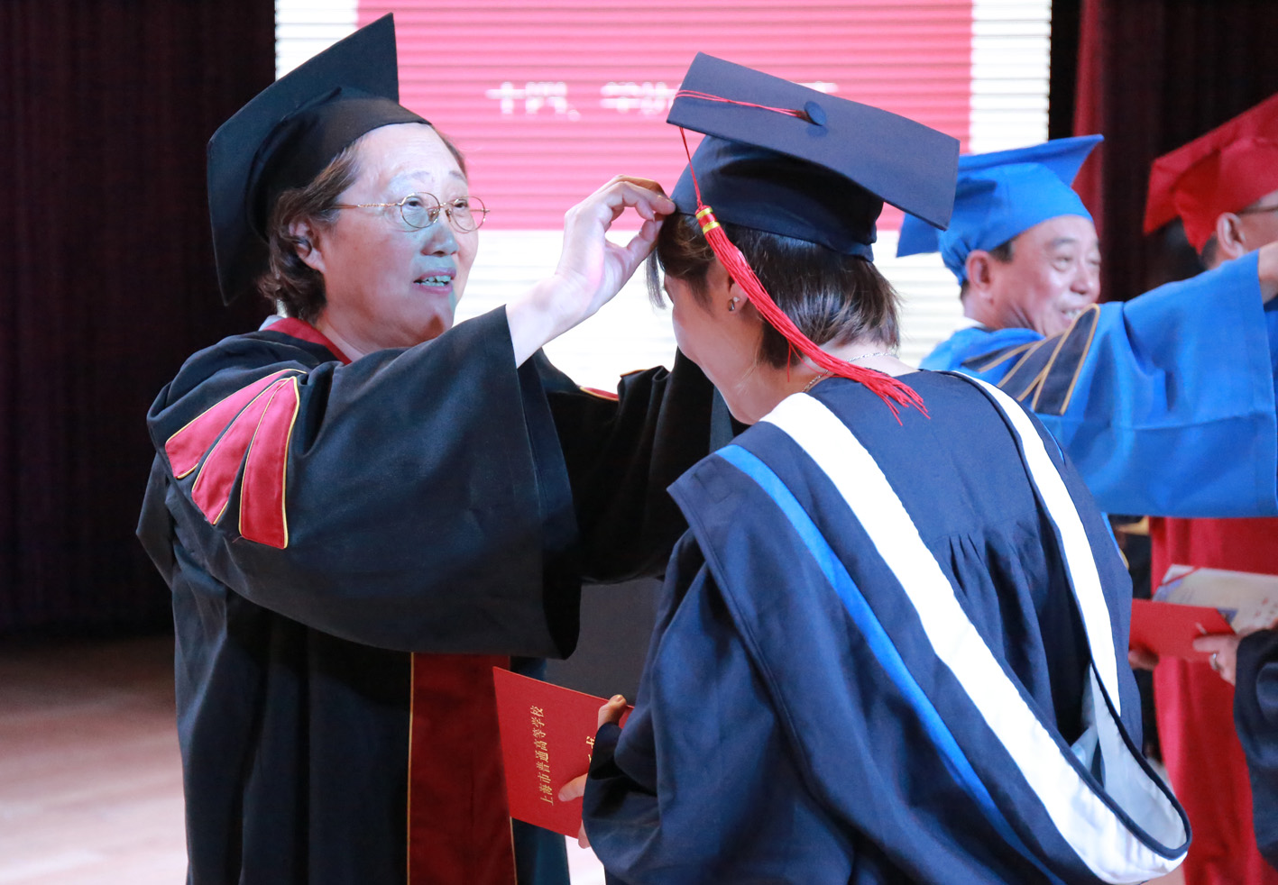 今年我校共有畢業(yè)生1465名,其中1240名學(xué)生順利畢業(yè)并獲得畢業(yè)證書,何勤勤等44名學(xué)生獲得了“上海市普通高等學(xué)校優(yōu)秀畢業(yè)生”的榮譽(yù)稱號,楊俊杰等25名學(xué)生獲得了“上海震旦職業(yè)學(xué)院優(yōu)秀畢業(yè)生”的榮譽(yù)稱號。在畢業(yè)典禮上,校領(lǐng)導(dǎo)向這69位同學(xué)頒發(fā)了榮譽(yù)證書。另外,朱書晴等28名同學(xué)成功考取了上海應(yīng)用技術(shù)大學(xué)等4所大學(xué)的全日制專升本。沈浩等8名同學(xué)已預(yù)報(bào)名參軍。