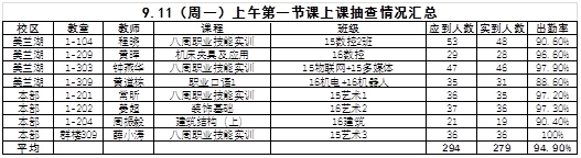 9月11日上午2017-2018學(xué)年第一學(xué)期正式開學(xué),清晨,領(lǐng)導(dǎo)和老師們就早早地來到了學(xué)校做開學(xué)的準(zhǔn)備工作,迎接新老同學(xué)入學(xué);2015級、2016級的同學(xué)們也是早早地等候在教室,等待8.30分正式開課。8.20分學(xué)校和有關(guān)部處領(lǐng)導(dǎo)們就聚集在會議室,鈴響后張理事長、張沈董事長、陳校長、黃書記、夏書記就帶領(lǐng)有關(guān)部處領(lǐng)導(dǎo),分四路深入校本部和美蘭湖校區(qū),到教室、實(shí)驗(yàn)室檢查開學(xué)第一節(jié)課的上課情況,從檢查的結(jié)果來看,總體上教學(xué)秩序井然、課堂紀(jì)律良好,老師負(fù)責(zé),學(xué)生認(rèn)真,比上學(xué)期有顯著進(jìn)步。具體體現(xiàn)在一是老師們?nèi)跍?zhǔn)時上崗,備課充分、認(rèn)真施教,沒有發(fā)現(xiàn)老師遲到等違紀(jì)現(xiàn)象;二是學(xué)生們經(jīng)過一個暑假的休息調(diào)整,精神面貌煥然一新,出勤率及紀(jì)律都比上學(xué)期有明顯提高,平均出勤率在94.9%(詳見下表);