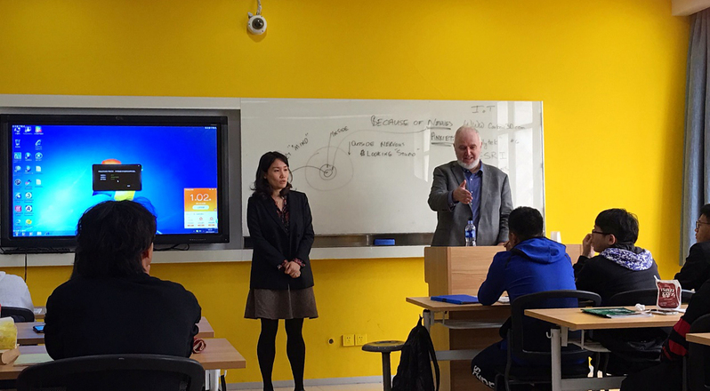 加州浸會大學(xué)(CBU)成立于 1950 年,被“美國新聞與世界報道”評為全美頂尖大學(xué)之一,美國西部大學(xué)排名第38位。自2016年起,我校與加州浸會大學(xué)開展了“國際物聯(lián)網(wǎng)(中美合作)”專業(yè),旨在培養(yǎng)具備全球視野的高素質(zhì)物聯(lián)網(wǎng)專業(yè)人才。因此,此次訪問,Dr. Donaldson特意走入17級國際物聯(lián)網(wǎng)專業(yè)的課堂,與同學(xué)們親切交流,及時了解學(xué)習(xí)動態(tài)。