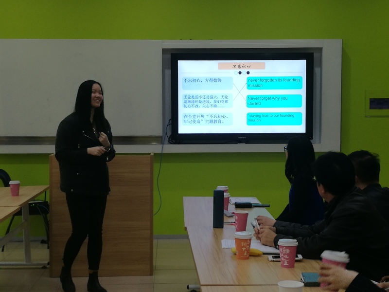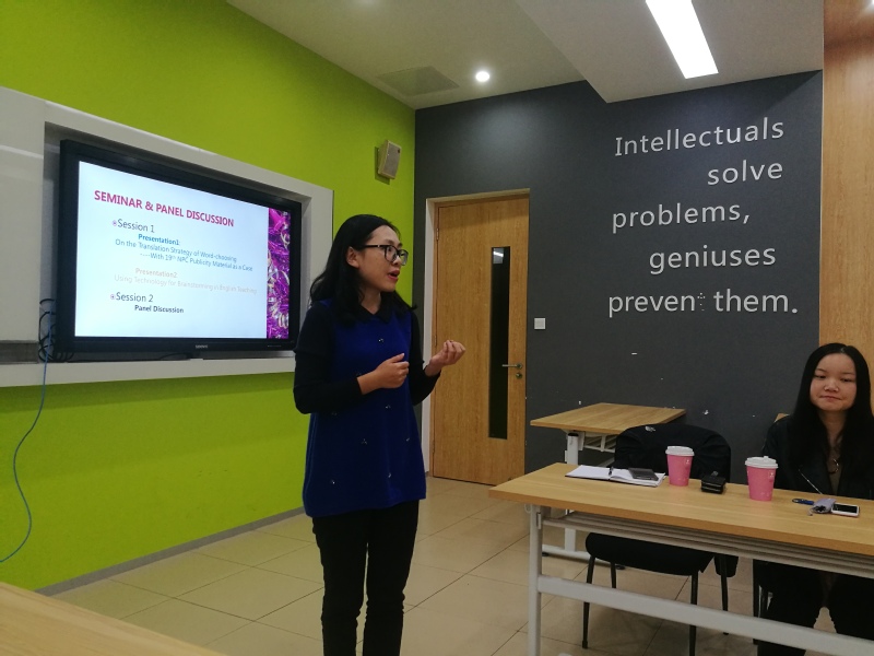 本次教學(xué)研共同體活動按國際化的學(xué)術(shù)研討會模式,營造了全英文的研討氛圍。首先,以學(xué)術(shù)研究的角度解讀“十九大”報告,創(chuàng)新了思政學(xué)習(xí)模式?;谄叫姓Z料庫理論架構(gòu),袁琨老師作了報告:On the Translation Strategy of Word-choosing----With 19th NPC Publicity Material as a Case(“十九大”外宣材料的選詞策略)。各位老師都獲益匪淺,既進(jìn)行了英語專業(yè)學(xué)術(shù)研討,也學(xué)習(xí)了“十九大”報告。