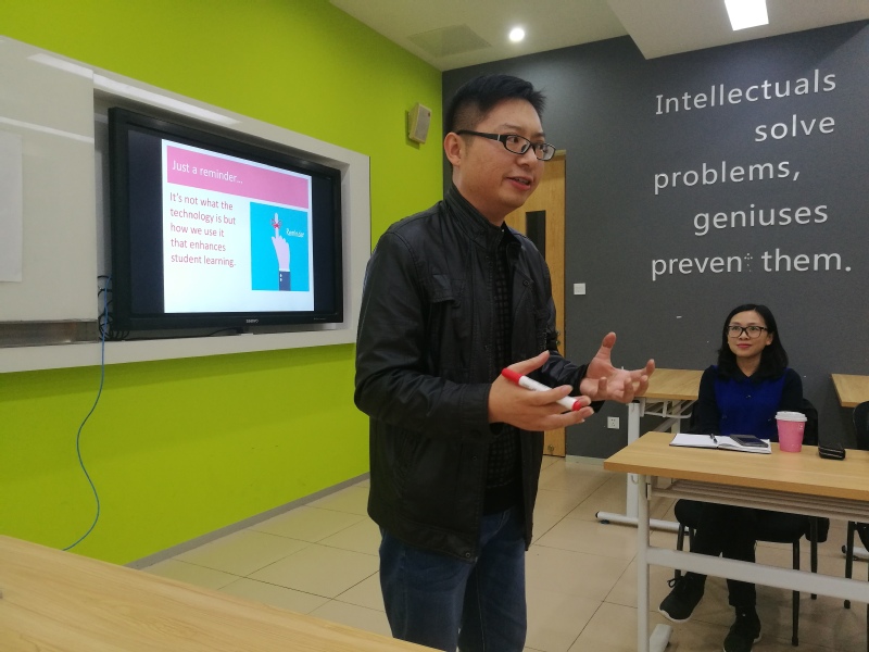 之后,以創(chuàng)新教學(xué)手段的角度,王斌老師作了報告:Using Technology for Brainstorming in English Teaching(使用科技手段促進(jìn)英語教學(xué)互動), 匯報了英國培訓(xùn)期間的學(xué)習(xí)成果,并與全體教師進(jìn)行了現(xiàn)場實(shí)踐,現(xiàn)場氣氛熱烈,大家都認(rèn)為這既是與國際接軌的教學(xué)技術(shù)手段研究和實(shí)踐,也是一堂精彩的觀摩課。