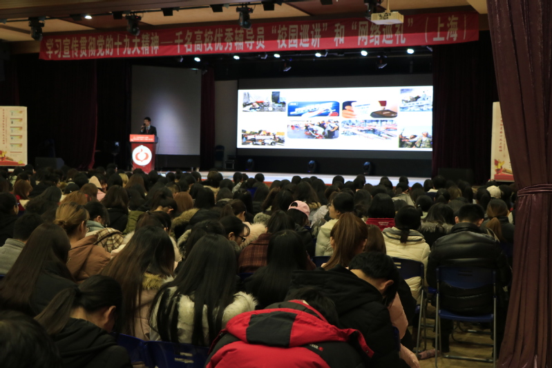 本組巡講團(tuán)由上海交通大學(xué)團(tuán)委副書記武超帶隊(duì),成員包括:東華大學(xué)紡織學(xué)院輔導(dǎo)員魏金婷、上海立信會(huì)計(jì)金融學(xué)院信息管理學(xué)院輔導(dǎo)員王琿、上海財(cái)經(jīng)大學(xué)法學(xué)院學(xué)工辦主任付卓婧及上海師范大學(xué)馬克思主義學(xué)院輔導(dǎo)員陳琳。他們分別以《逐夢(mèng)新時(shí)代當(dāng)代青年的選擇》、《增強(qiáng)四個(gè)自信坐自信號(hào)列車》、《書寫新時(shí)代堅(jiān)定青年人的文化自信》、《走進(jìn)新時(shí)代,奏響全國依法治國的最強(qiáng)音》、《邁入新時(shí)代黨的使命與青年擔(dān)當(dāng)》為題,用身邊人講述身邊事的方式,生動(dòng)活潑地解讀了新時(shí)代、責(zé)任、使命、自信、文化、法治等方面的十九大精神內(nèi)涵, 將習(xí)近平新時(shí)代中國特色社會(huì)主義思想、十九大報(bào)告的重要精神、總書記關(guān)于青年成長成才重要思想論述等一系列問題進(jìn)行了系統(tǒng)梳理和深入解析。他們用鮮活的事例、翔實(shí)的數(shù)據(jù)、生動(dòng)的表述,引起了我校師生的強(qiáng)烈共鳴。聆聽報(bào)告的師生們紛紛表示:整場報(bào)告主題鮮明、內(nèi)涵豐富,對(duì)我們深入學(xué)習(xí)領(lǐng)會(huì)、全面貫徹落實(shí)黨的十九大精神,起到了很好的推動(dòng)作用。