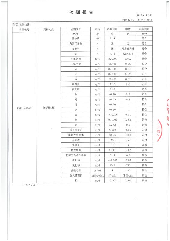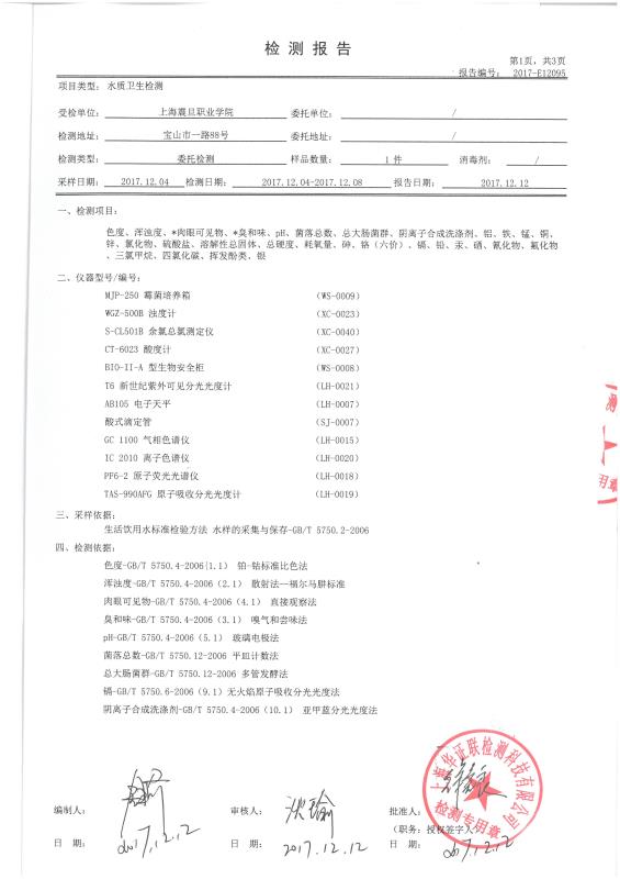 為了保障學(xué)校師生飲用水安全問題,由第三方檢測單位對我校飲用水按照國家生活飲用水衛(wèi)生標準進行檢測,檢測項目多達30項,具體結(jié)果公布如下: