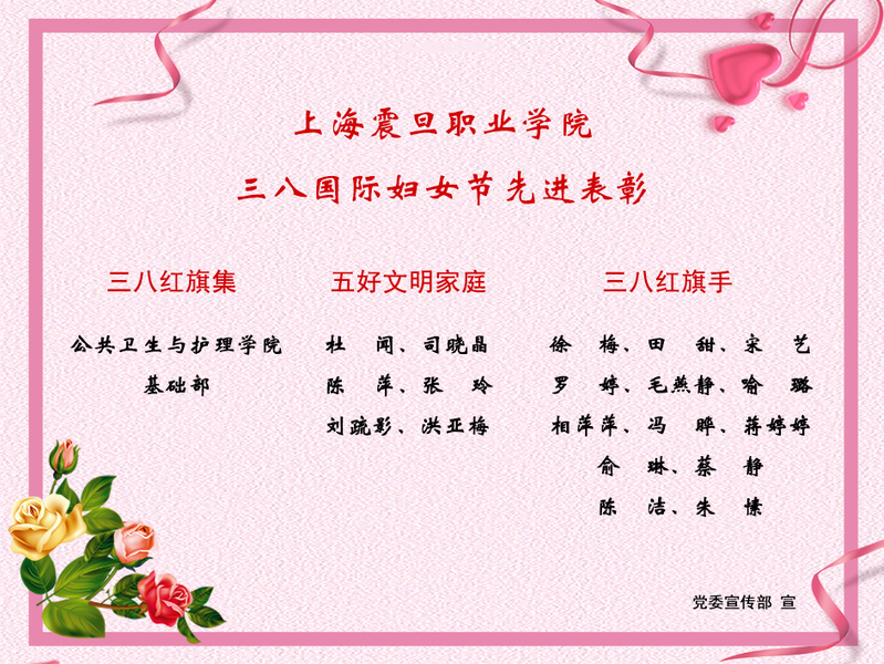 大會(huì)首先由王純玉副校長宣讀《上海震旦教育集團(tuán)2017年度“三八”紅旗集體、“三八”紅旗手、“五好”文明家庭獲獎(jiǎng)名單》,與會(huì)領(lǐng)導(dǎo)為受表彰的先進(jìn)女教職工頒發(fā)榮譽(yù)證書。學(xué)?;A(chǔ)部袁琨老師和機(jī)電工程學(xué)院陳萍老師分別代表三八紅旗集體和五好文明家庭上臺(tái)發(fā)言。