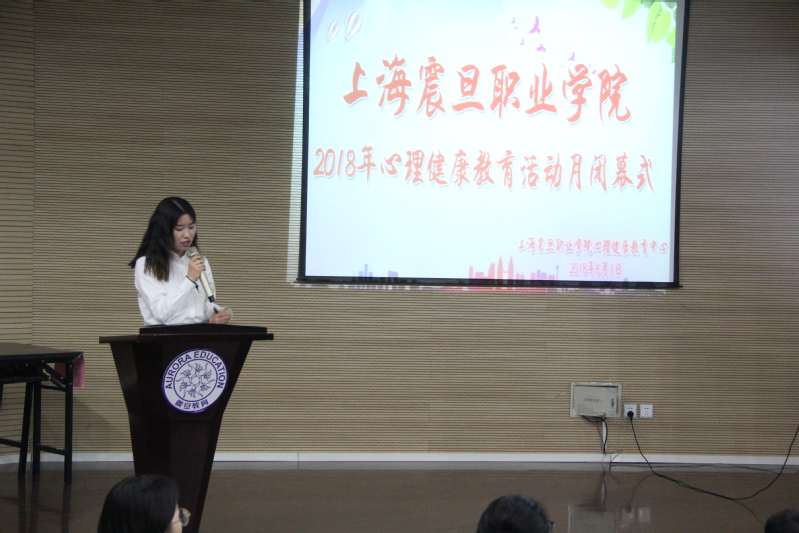 2018年6月1日下午13:00在體藝樓報(bào)告廳,校心理健康教育中心隆重舉辦了 2018年度心理健康教育活動(dòng)月閉幕式。上海震旦職業(yè)學(xué)院黨委副書記夏臻老師,學(xué)生處處長(zhǎng)、心理健康教育中心主任毛燕靜老師,團(tuán)委書記曹曉莉老師,以及喻璐老師、武俠老師、武瑩瑩老師、梁甜老師、程冰老師6名校心理健康教育中心專兼職老師、80余名學(xué)生出席了本次閉幕式。公共衛(wèi)生與護(hù)理學(xué)院學(xué)生王濤、冉茂月?lián)伍]幕式主持人。