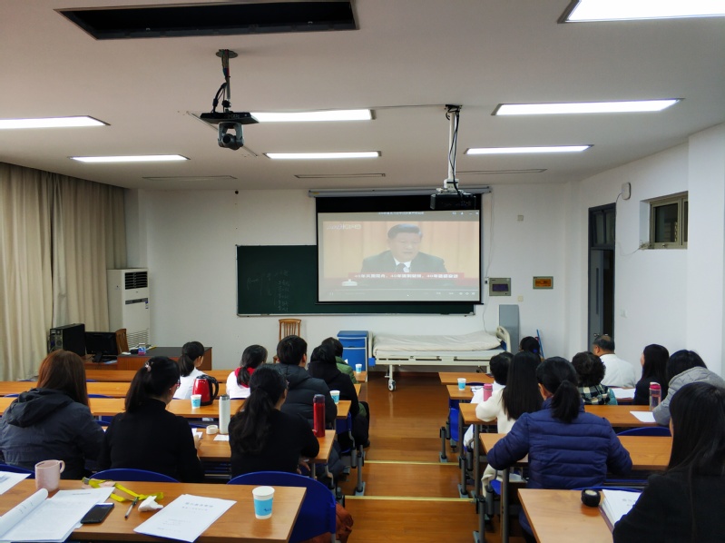 黨委中心組在學(xué)院會(huì)議室集中收看直播,各二級(jí)學(xué)院組織師生在各自辦公室和教室收看,還有通過(guò)手機(jī)觀看直播。下午上課的教師,在上課時(shí)也及時(shí)向同學(xué)宣講了大會(huì)的內(nèi)容。