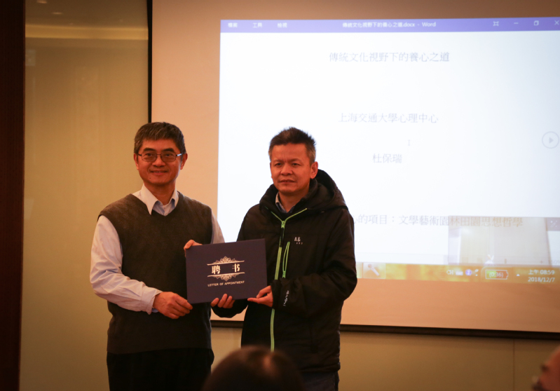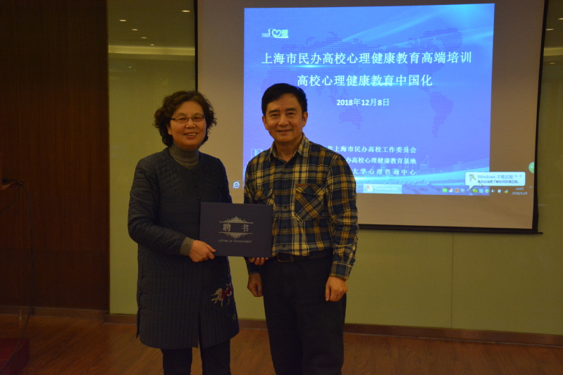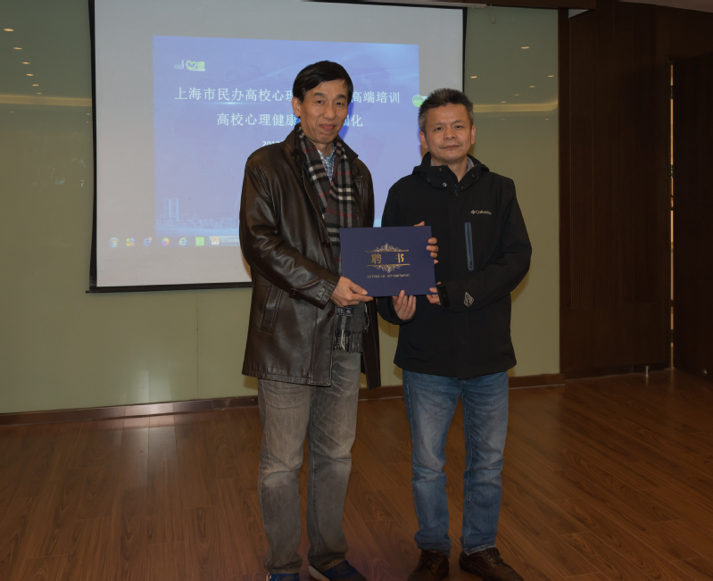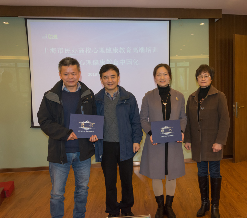 上海震旦職業(yè)學(xué)院黃晞建書記和夏臻副書記為上海交通大學(xué)心理咨詢中心楊文圣主任和汪國(guó)琴副主任頒發(fā)聘書。