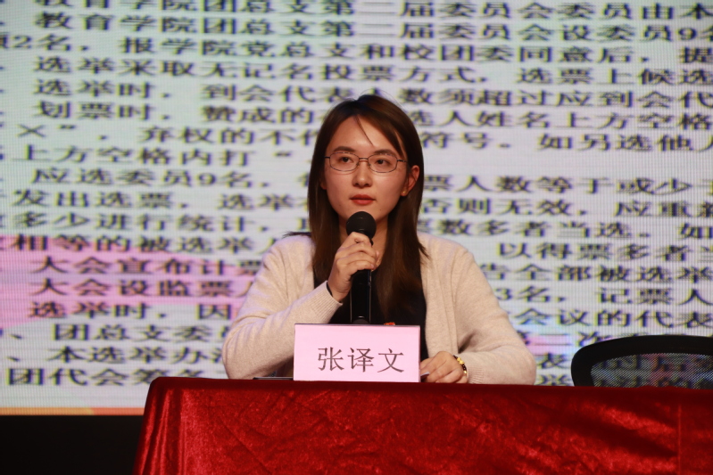 張譯文老師宣讀《教育學(xué)院團(tuán)總支第二屆委員會(huì)委員選舉辦法》,并經(jīng)舉手表決,一致通過。