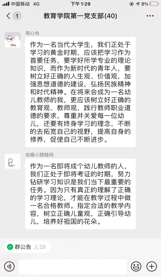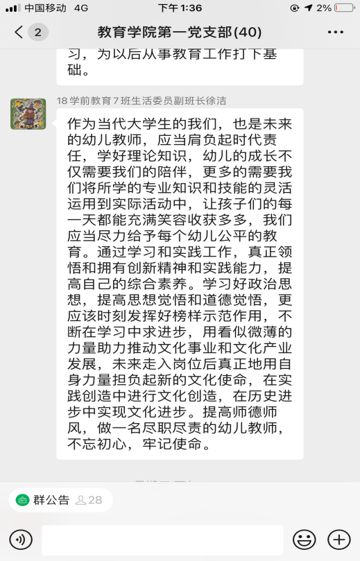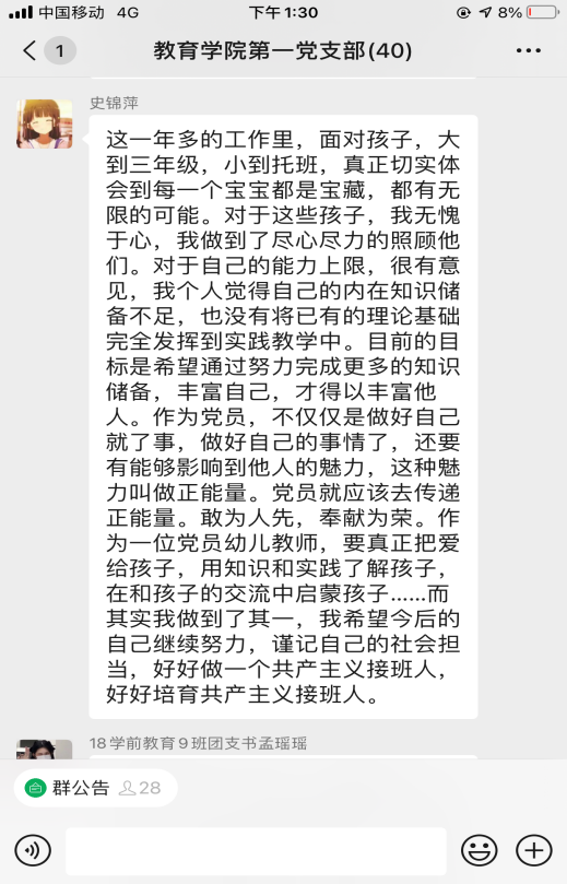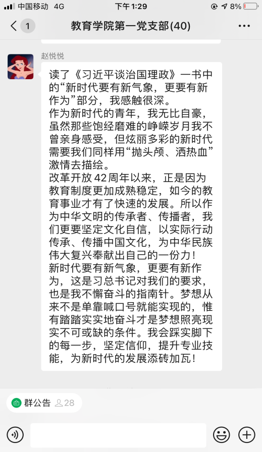 活動(dòng)開始,黨總支副書記楊彥琛同志帶領(lǐng)全體黨員認(rèn)真學(xué)習(xí)《習(xí)近平談治國理政》第三卷第一章節(jié)“譜寫新時(shí)代中國特色社會(huì)主義新篇章”。大家圍繞堅(jiān)定文化自信,作為大學(xué)生黨員、黨員教師、幼兒教師,我們應(yīng)該怎么做;新時(shí)代要有新氣象,更要有新作為,作為青年人我們應(yīng)該在“兩個(gè)一百年”的歷史交匯期能做些什么兩個(gè)主題并結(jié)合自己的學(xué)習(xí)體會(huì)進(jìn)行了研討交流。