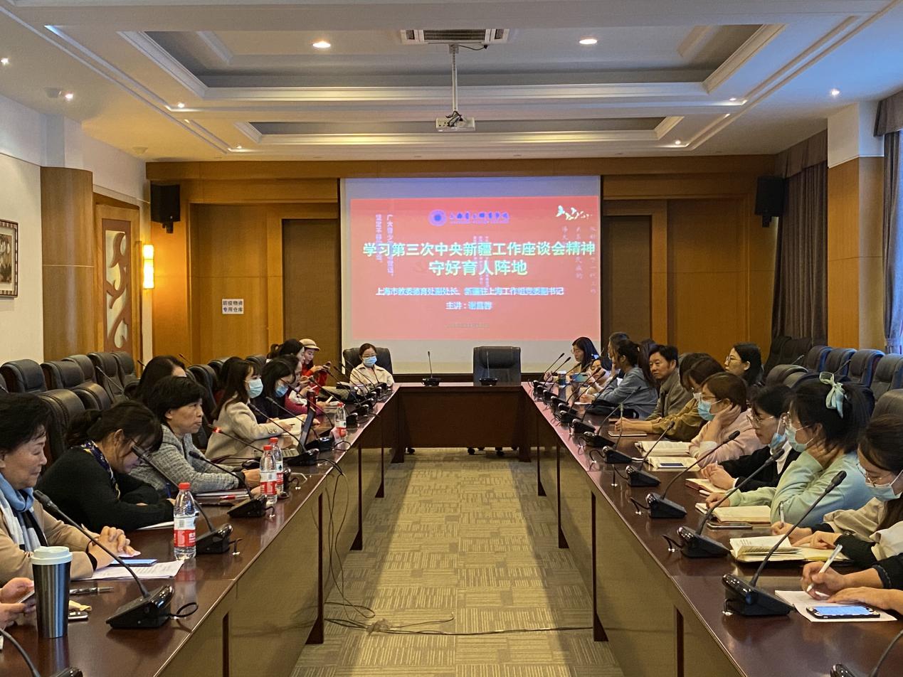 2020年11月13日下午13:00,由新疆駐上海工作組黨委書記、上海市教委德育處副處長謝昌蓉主講的《學習第三次中央新疆工作座談會精神——守好育人陣地》講座在我校體藝樓國際會議中心舉行。副校長王純玉、學生處處長曹曉莉、各學院院長、書記以及輔導員、教師代表出席了講座。講座由副校長王純玉主持。