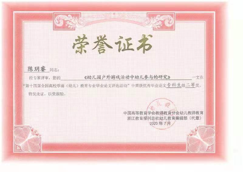 第十四屆全國(guó)高校學(xué)前(幼兒)教育專業(yè)優(yōu)秀畢業(yè)論文評(píng)選活動(dòng)于2020年6月順利進(jìn)行。經(jīng)過華東師范大學(xué)、南京師范大學(xué)、華南師范大學(xué)等高校專家盲審,我校17級(jí)學(xué)前教育專業(yè)2班陳玥睿同學(xué)的畢業(yè)論文《幼兒園戶外游戲活動(dòng)中幼兒參與的研究》在全國(guó)800余所高校的1300余篇優(yōu)秀畢業(yè)論文中脫穎而出,榮獲專科組二等獎(jiǎng)。