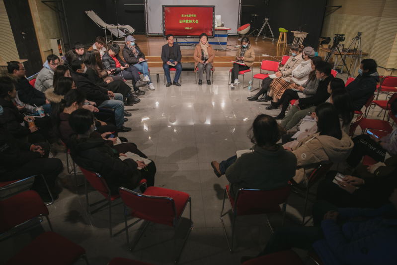 東方電影學(xué)院副院長祝華東老師講話。他從“兩院合并的意義”、“內(nèi)部資源的優(yōu)化與共享”、“教學(xué)過程優(yōu)化與效果提升”、“專業(yè)技能培養(yǎng)與崗位對標(biāo)”等四個方面談了自己對新學(xué)院成立后教學(xué)工作、專業(yè)建設(shè)、課程建設(shè)、產(chǎn)學(xué)結(jié)合、校企合作的深度思考。并圍繞學(xué)院今后的工作提出了四點(diǎn)要求:一是面對學(xué)校轉(zhuǎn)設(shè)、十四五規(guī)劃開局的新形勢、新任務(wù)、新要求,全體教師要創(chuàng)新思維,緊緊跟上學(xué)校發(fā)展的步伐,在教學(xué)實(shí)踐、產(chǎn)教融合、校企合作等方面不斷探索新思路新方法;二是加快教師間的融合、工作間的磨合、專業(yè)課程間的結(jié)合,“老東影”、“老傳媒”都已成為歷史,曾經(jīng)的成績都已翻篇,要面向未來開啟新的篇章;三是優(yōu)化專業(yè)和課程設(shè)置、優(yōu)化人員配置,要求各專業(yè)主任注重加強(qiáng)本專業(yè)教學(xué)、科研工作,立足專業(yè)規(guī)律、市場需求做好人才培養(yǎng)方案的調(diào)整,充分調(diào)動專業(yè)教師的工作積極性和能動性,不斷打造專業(yè)亮點(diǎn),形成專業(yè)特色,擦亮東方電影學(xué)院這塊品牌;四是加強(qiáng)教學(xué)過程的組織和優(yōu)化,把握學(xué)生的關(guān)注點(diǎn),了解學(xué)生的缺失點(diǎn),知曉學(xué)生的需求點(diǎn),填缺口補(bǔ)短板,不斷優(yōu)化人才培養(yǎng)過程`,實(shí)現(xiàn)教學(xué)質(zhì)量的穩(wěn)步提高。針對招生工作,祝華東副院長強(qiáng)調(diào),招生工作是學(xué)院的生命線,是學(xué)院生存和發(fā)展的基礎(chǔ),希望全院師生行動起來共同參與招生,廣泛匯集社會資源,凝心聚力,眾志成城,取得今年招生工作的新勝利。