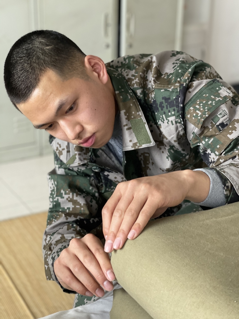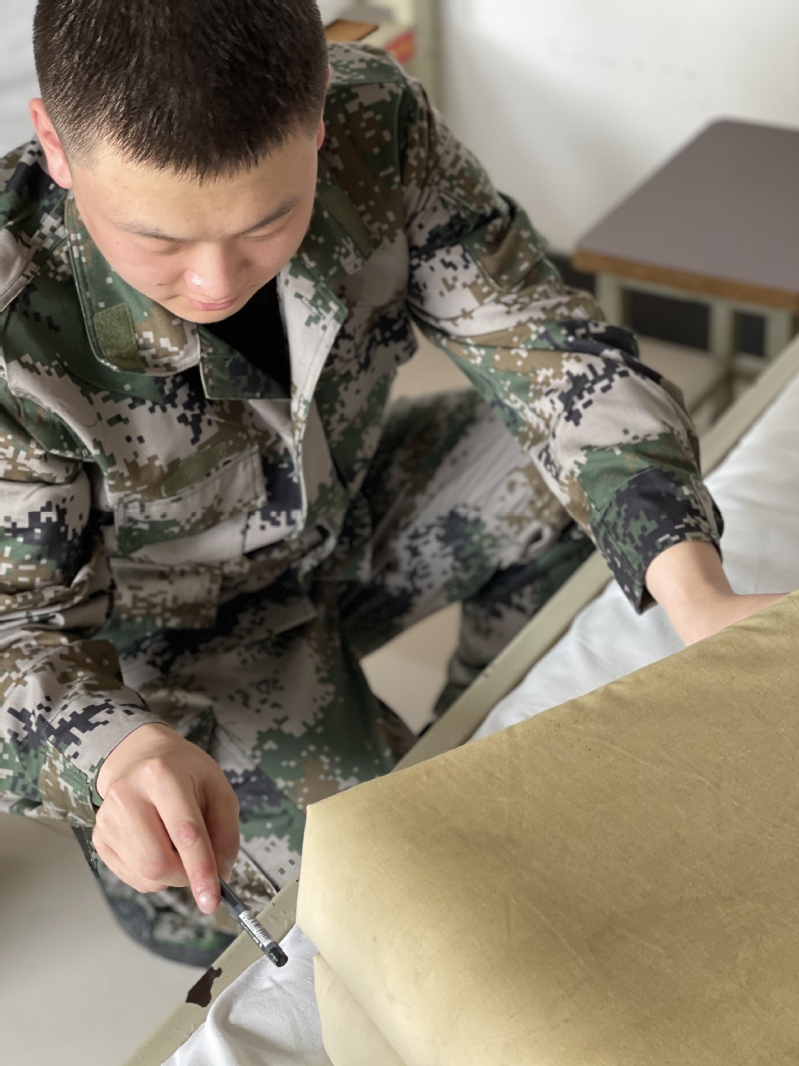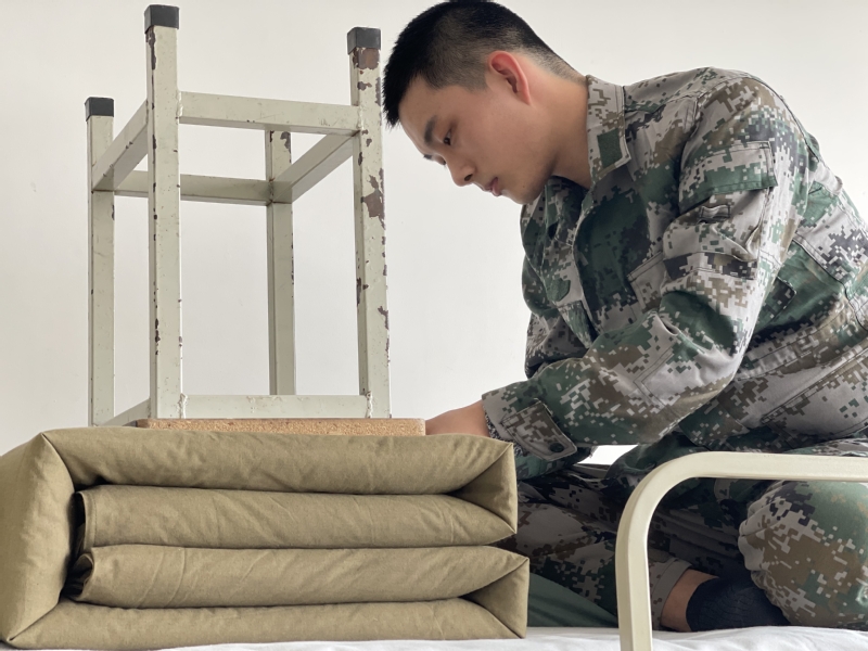 初入軍營,先從學習整理內(nèi)務(wù)開始,學習如何鋪床、疊軍被、規(guī)范個人物品的擺放。在軍營就要以軍人的優(yōu)秀品質(zhì)和標準來要求自己。壓床被、理枕頭、磨棱角,沒幾天,整潔干凈的床上都擺上一個個標準的“豆腐塊”。