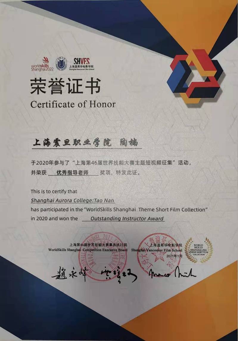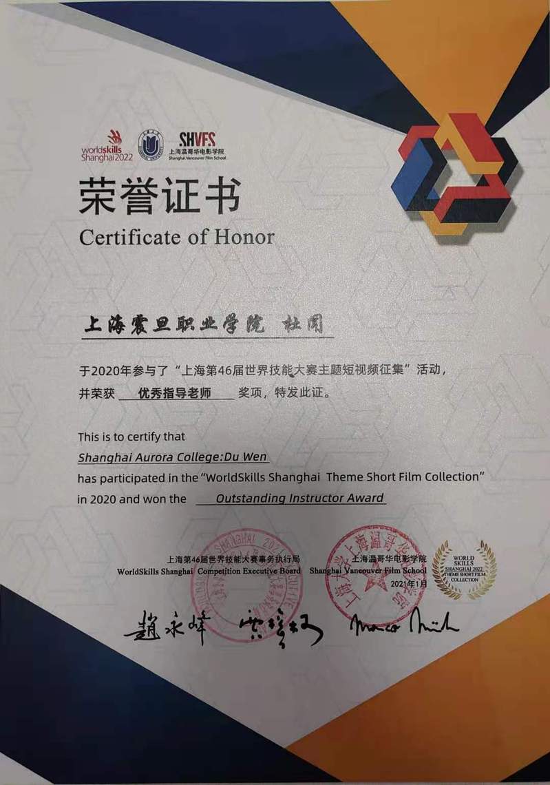 近日,我校在上海第46屆世界技能大賽主題短視頻征集活動中榮獲“優(yōu)秀組織獎”,東方電影學(xué)院杜聞、陶楠兩位老師獲“優(yōu)秀指導(dǎo)老師”獎。