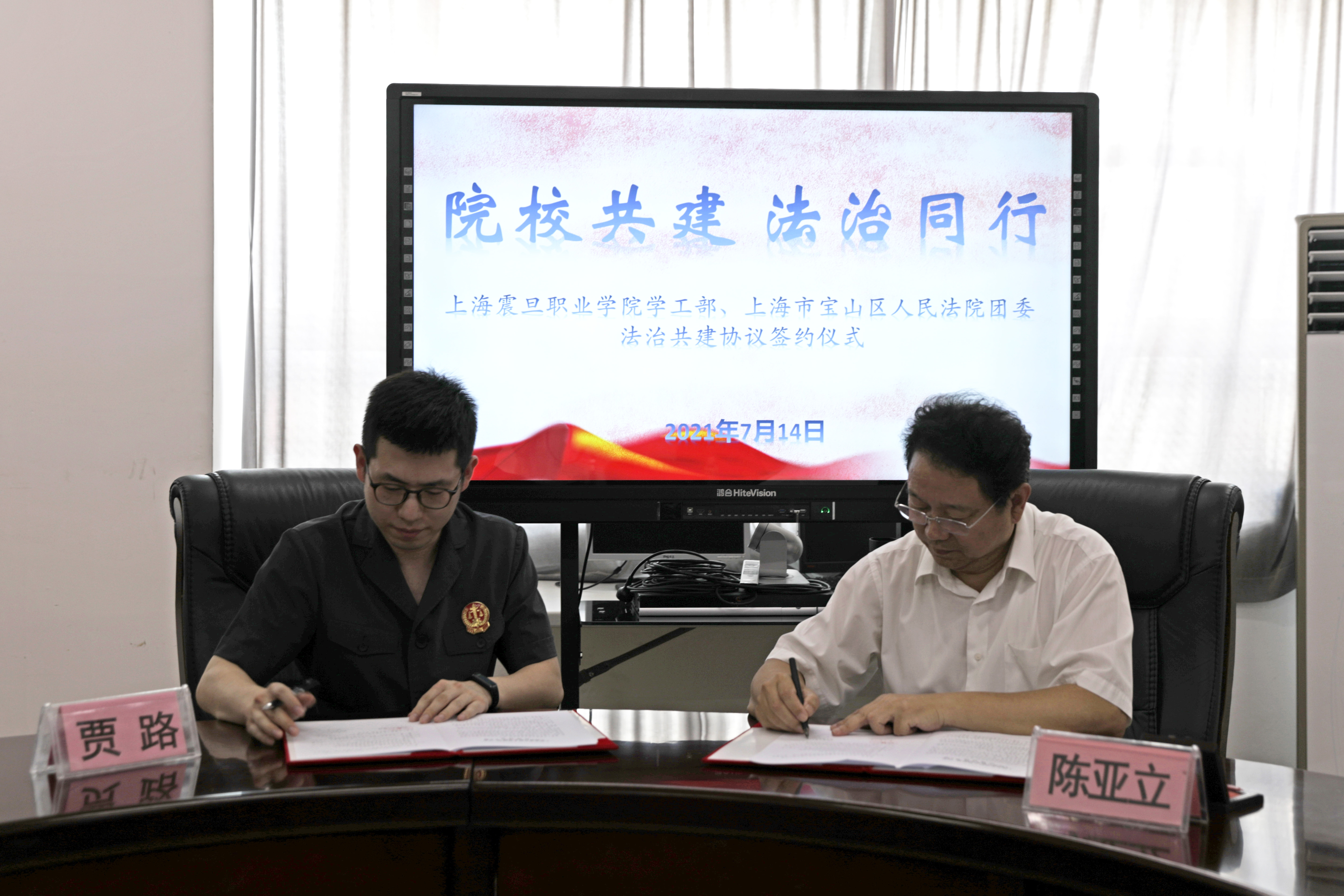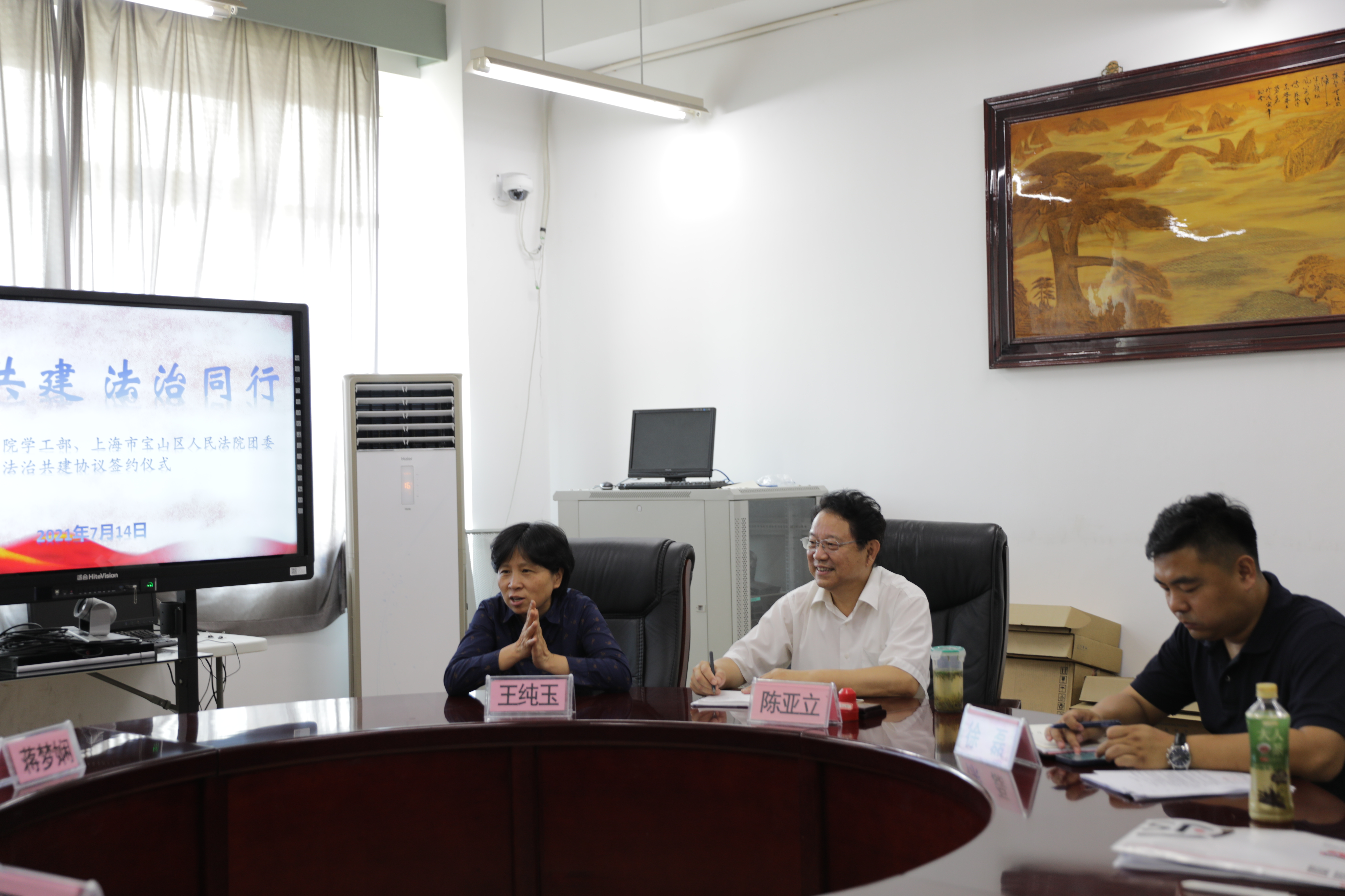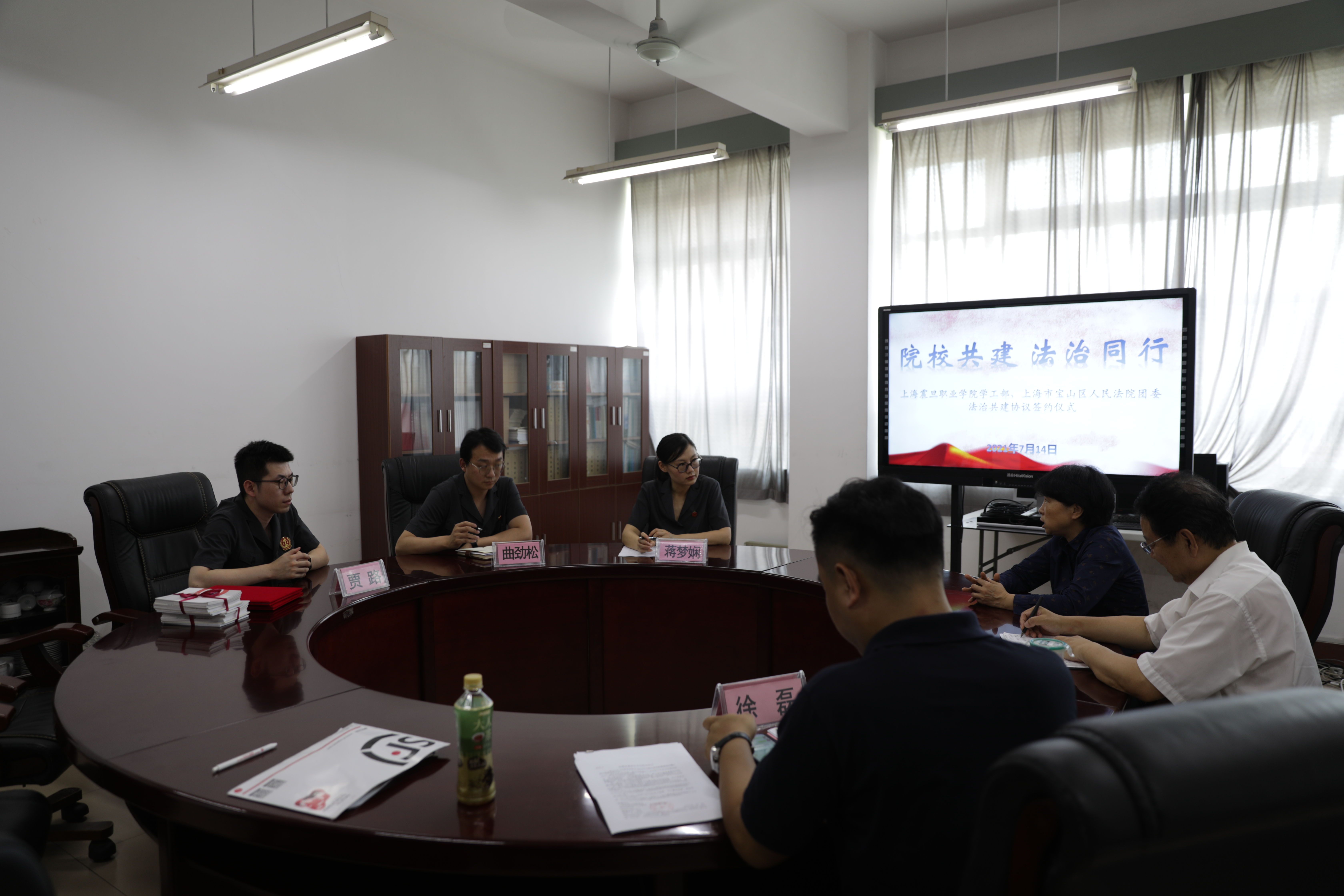 7月14日,我校學(xué)工部與寶山區(qū)法院團委在1-407小會議室簽訂了院校法治同行共建協(xié)議,區(qū)法院審判監(jiān)督庭庭長蔣夢嫻、團委書記賈路及月浦法庭曲勁松法官,我校王純玉副校長、學(xué)工部陳亞立部長、保衛(wèi)處徐磊處長出席。簽約儀式由徐磊主持。