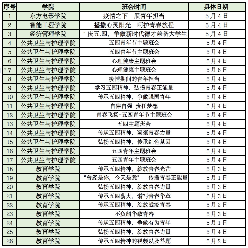 五四青年節(jié),我校各二級學(xué)院在學(xué)生處組織下,發(fā)揮專業(yè)所長,從不同方面組織策劃多場主題班會(huì),讓莘莘學(xué)子感受五四精神的正能量。