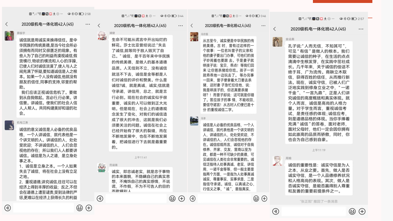 在群聊討論環(huán)節(jié),同學(xué)們結(jié)合當(dāng)前的誠(chéng)信現(xiàn)象踴躍發(fā)言。喬羿楓同學(xué)說(shuō),我國(guó)優(yōu)秀文化傳統(tǒng)不斷提醒人們應(yīng)該怎么做,不應(yīng)該怎么做。薛振宇同學(xué)說(shuō),如果一個(gè)人沒(méi)有誠(chéng)信,他就沒(méi)有朋友的信任,同事的支持,鄰里的幫助。楊學(xué)勇同學(xué)說(shuō),如果沒(méi)有了誠(chéng)信,人們也就不會(huì)互相合作。董道利說(shuō),誠(chéng)信不是一句口號(hào),不是一個(gè)噱頭,而在于生活工作的時(shí)時(shí)處處,在于點(diǎn)點(diǎn)滴滴的每一件小事、每個(gè)細(xì)節(jié)。周榆同學(xué)說(shuō),做人是否誠(chéng)信,是一個(gè)人品德修養(yǎng)狀況和人格高尚的表現(xiàn)。張正陽(yáng)同學(xué)說(shuō),大學(xué)生應(yīng)該具備固守誠(chéng)信講信用,守諾言的優(yōu)秀品質(zhì)。金運(yùn)奧同學(xué)說(shuō),對(duì)于學(xué)生而言,重視誠(chéng)信考試,是責(zé)任感的體現(xiàn)。