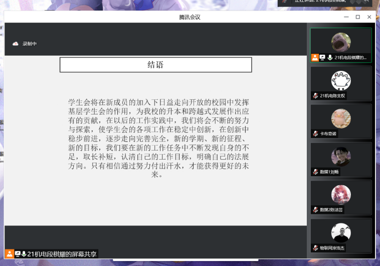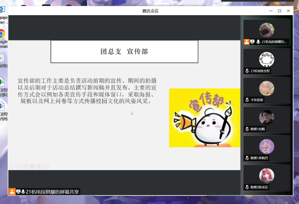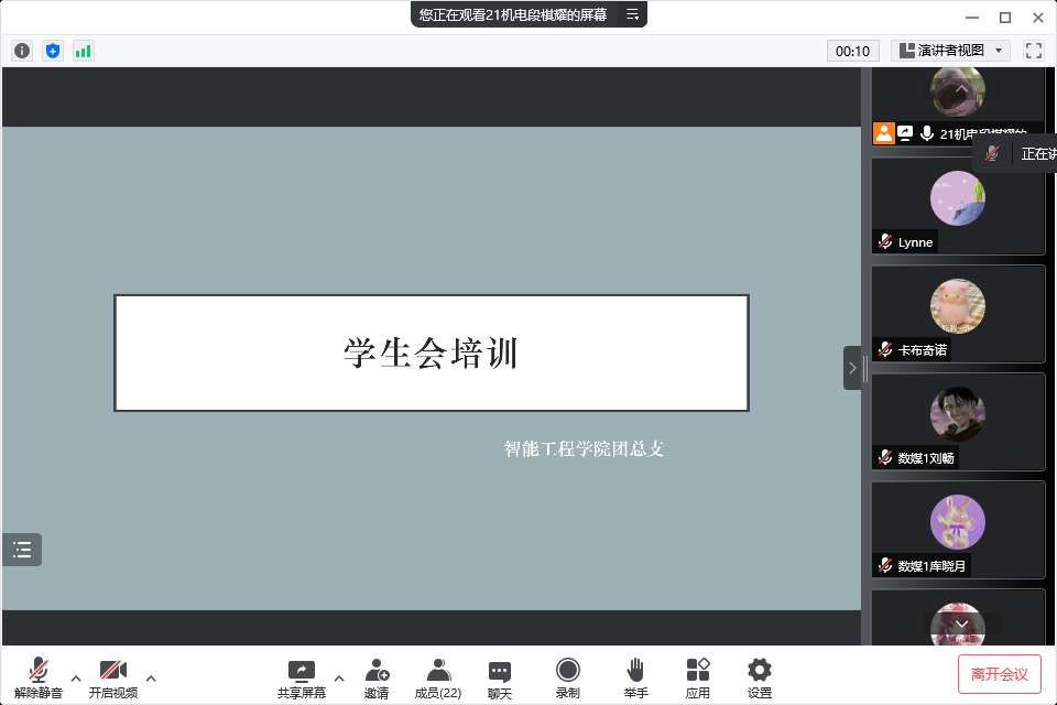 根據(jù)校學(xué)生會(huì)春季學(xué)期培訓(xùn)部署安排,為做好換屆后的團(tuán)總支學(xué)生會(huì)成員的培訓(xùn)工作,幫助新成員進(jìn)一步了解團(tuán)總支學(xué)生會(huì)各部門(mén)的工作職責(zé)和內(nèi)容,2022年5月16日晚18點(diǎn)30分,智能工程學(xué)院2022年春季學(xué)期學(xué)生會(huì)組織培訓(xùn)會(huì)(第一場(chǎng))在騰訊會(huì)議召開(kāi)。