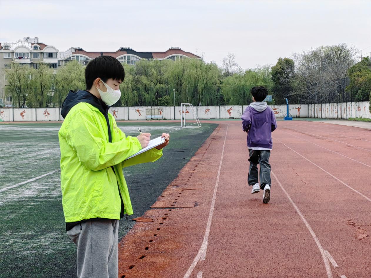 李炎在操場為自主招生體育校測的同學做好成績記錄