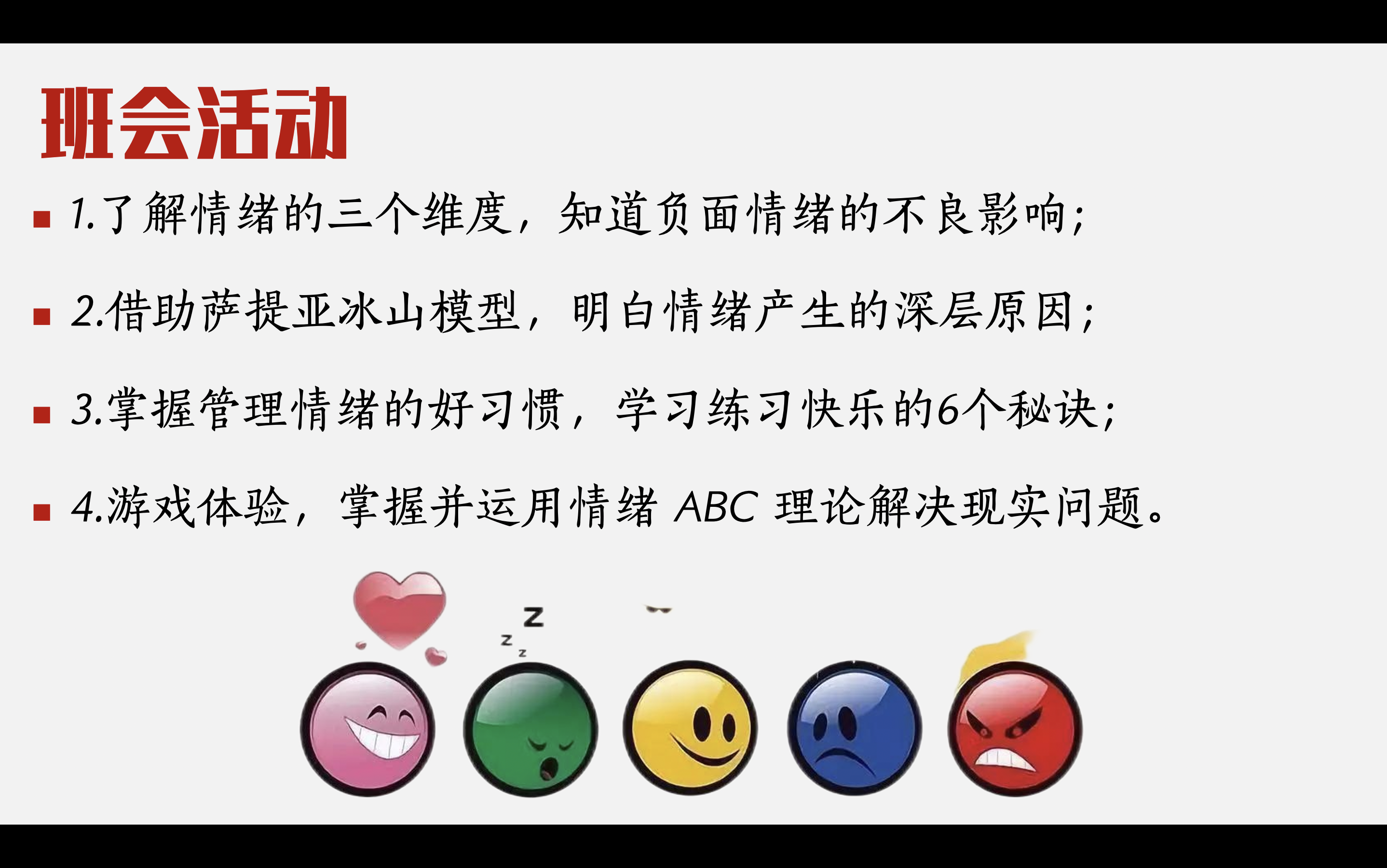 三.活動過程。認(rèn)識“情緒”真面目:什么是“情緒”、解讀情緒的三個維度、負面情緒的不良影響;了解情緒的深層原因:播放視頻《薩提爾的內(nèi)在冰山》、真實故事的練習(xí)、深層次探索、啟示;管理情緒,練習(xí)快樂:交流討論‘網(wǎng)上有這樣一句話:“不要因為5分鐘的不開心,就耽誤你23小時55分鐘的開心’。游戲體驗;情景還原、播放視頻《情緒ABC理論》、故事新編、欣賞歌曲《海闊天空》