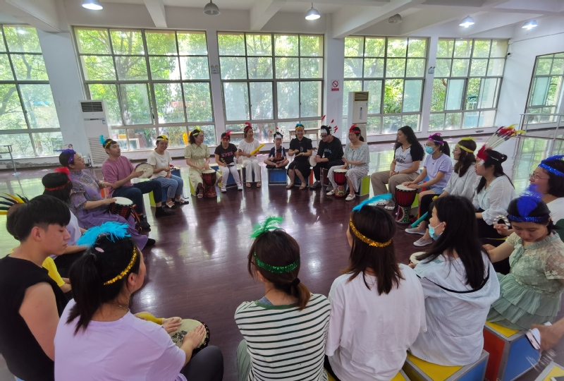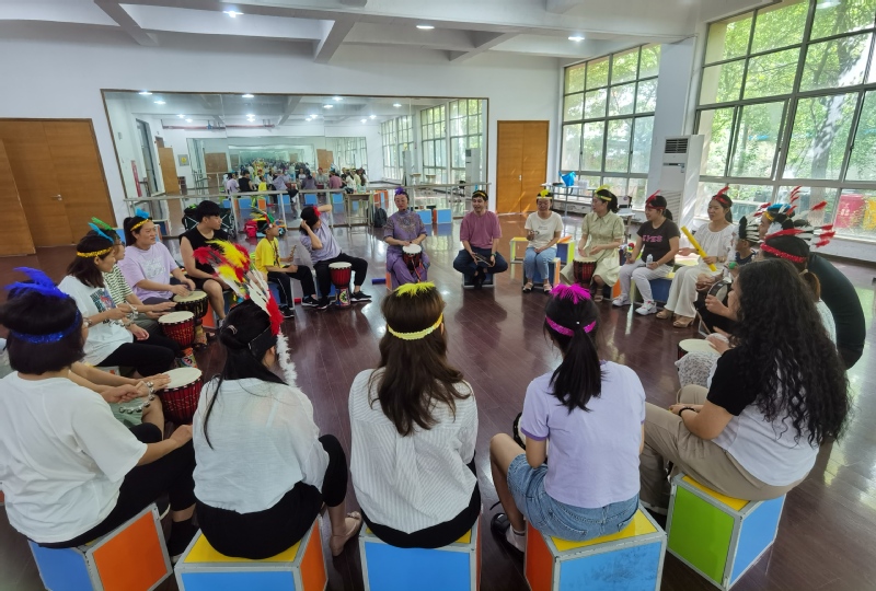 隨后,聶老師進(jìn)入鼓圈中間,通過(guò)節(jié)奏、分聲部、三點(diǎn)雷達(dá)等技術(shù)引導(dǎo)輔導(dǎo)員們體驗(yàn)鼓圈的團(tuán)隊(duì)精神和節(jié)奏魅力。聶老師還講解了非洲鼓的起源,并教大家演奏非洲鼓。來(lái)自新疆的夏依旦老師和林忠蘭老師在《掀起你的蓋頭來(lái)》的音樂(lè)中翩翩起舞,馬合木提老師打鼓伴奏,聶老師吹琴伴奏,將整個(gè)活動(dòng)的氣氛推向了高潮。