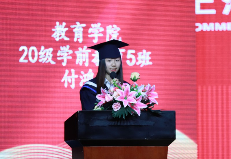教育學(xué)院20學(xué)前5班的付鴻雁同學(xué)代表2023屆畢業(yè)生發(fā)言。她表示將不忘“崇尚科學(xué)、注重文藝、不講教理”的校訓(xùn)及“以人為本、育人育能、德育為先、教會做人”的教育理念,帶著母校的期望、老師的教誨、朋友的鼓勵,砥礪前行,做個懷揣夢想腳踏實地的人,以青春之名,赴時代之約。