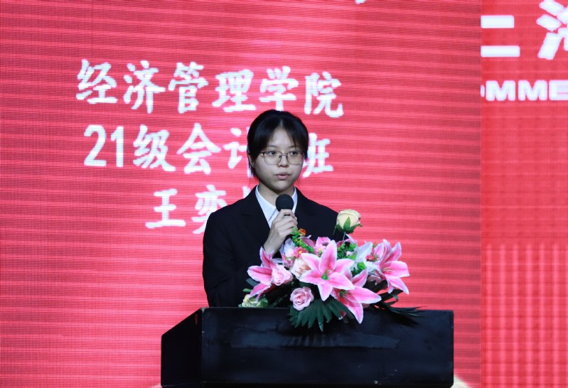經(jīng)濟(jì)管理學(xué)院21會計2班王奕楠同學(xué)代表在校生發(fā)言。她說,作為學(xué)弟學(xué)妹,我們會時刻以學(xué)姐學(xué)長為榜樣,以奮斗的姿態(tài)激揚青春,不負(fù)時代,不負(fù)華年;以勇敢的狀態(tài)展現(xiàn)青春,踔厲奮發(fā),篤行不?。灰园莸男膽B(tài)擁抱青春,求真務(wù)實,追求卓越。祝愿2023屆的學(xué)姐學(xué)長們前程似錦,一帆風(fēng)順。