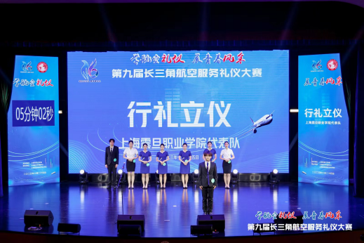 本次大賽分為四個環(huán)節(jié),第一個環(huán)節(jié)是“行禮立儀”。選手需集體展示航空基礎(chǔ)禮儀。賽場上,震旦學(xué)子們以自信和嫻熟的動作展示出航空服務(wù)的專業(yè)性和高標(biāo)準(zhǔn)。