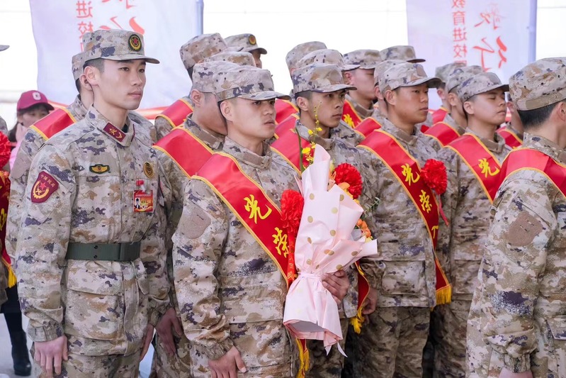 歡送會現(xiàn)場,經(jīng)過體檢檢查、政治考核、役前教育等層層篩選的新兵們,胸帶大紅花、身著戎裝、身姿挺拔、精神抖擻、眼神堅定,充滿著對軍營生活的美好憧憬。