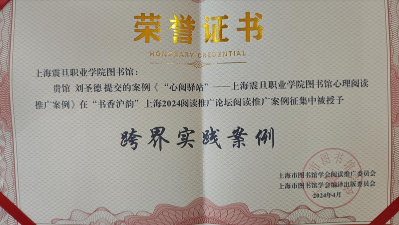 2024年4月3日上午,為宣傳圖書館全民閱讀的最佳實(shí)踐,總結(jié)和分享閱讀推廣的經(jīng)驗(yàn)和成果,推動圖書館界在閱讀推廣領(lǐng)域的交流與合作,積極推進(jìn)書香社會建設(shè),由上海市圖書館學(xué)會閱讀推廣委員會和編譯出版委員會共同主辦的“書香滬韻”——2024上海閱讀推廣論壇暨上海市圖書館學(xué)會閱讀推廣委員會成立十周年研討會在上海外國語大學(xué)順利舉行。會上,震旦職業(yè)學(xué)院圖書館劉圣德老師申報(bào)的《“心閱驛站”——震旦職業(yè)學(xué)院圖書館心理閱讀推廣案例》在眾多閱讀推廣案例中脫穎而出,獲得“跨界實(shí)踐案例”獎。