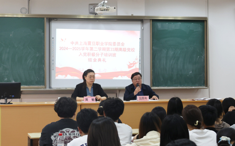 2025年4月16日下午,上海震旦職業(yè)學(xué)院第三十三期高級(jí)黨校入黨積極分子培訓(xùn)班結(jié)業(yè)典禮在教學(xué)樓1-209室舉行。黨委副書記黃敏、黨委組織部副部長(zhǎng)(主持工作)翁昊年、各二級(jí)學(xué)院黨總支書記以及第三十三期高級(jí)黨校全體學(xué)員參加了典禮。典禮由翁昊年主持。