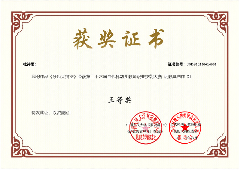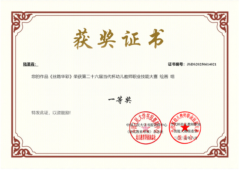 近日,第二十六屆“當(dāng)代杯”全國幼師技能大賽圓滿落幕。我校學(xué)子在多項(xiàng)賽事中脫穎而出,榮獲44項(xiàng)獎(jiǎng)項(xiàng),其中,一等獎(jiǎng)9項(xiàng),二等獎(jiǎng)18項(xiàng),三等獎(jiǎng)16項(xiàng),優(yōu)秀獎(jiǎng)1項(xiàng)。謝美玲、左斌營等老師獲“優(yōu)秀指導(dǎo)教師”獎(jiǎng)。上海震旦職業(yè)學(xué)院被評(píng)為“教育教學(xué)成果展示模范?!?。