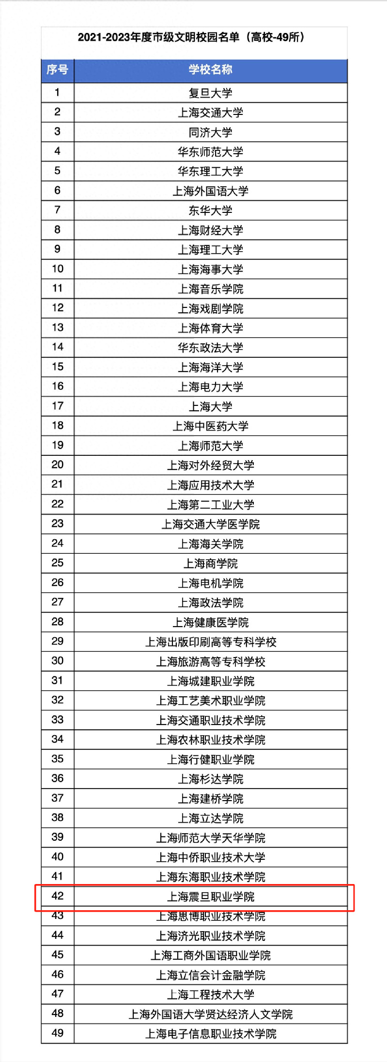 近日,上海市精神文明建設(shè)辦公室下發(fā)《完成2021-2023年度市級(jí)文明創(chuàng)建任務(wù)的城區(qū)、村鎮(zhèn)、單位、家庭、校園、社區(qū)(小區(qū))、行業(yè)名單》,上海震旦職業(yè)學(xué)院榮獲2021-2023年度“上海市文明校園”光榮稱號(hào)。