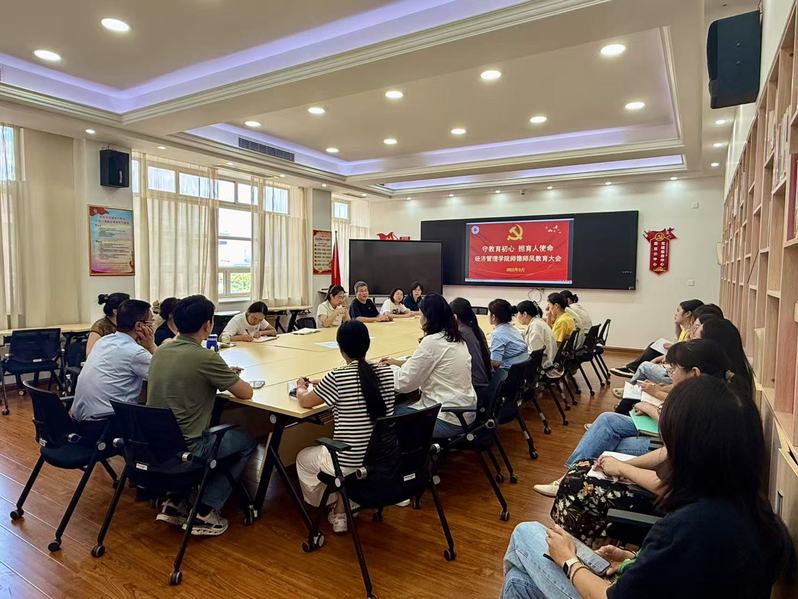 2025年9月12日下午13:00,經(jīng)濟(jì)管理學(xué)院召開教職員工師德師風(fēng)大會(huì)暨新學(xué)期教師工作會(huì)議,學(xué)院院長(zhǎng)胡守忠、副院長(zhǎng)曹鳳蘭及全體教師參會(huì),會(huì)議由學(xué)院黨總支書記鹿群主持。