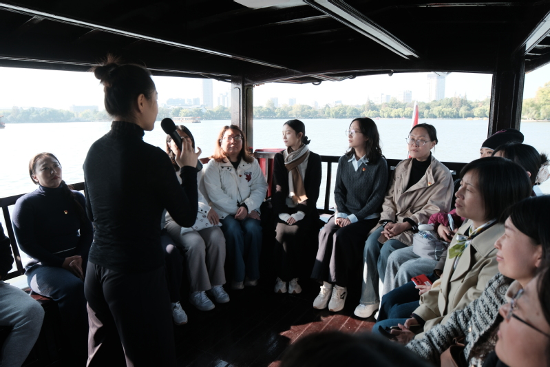 當(dāng)日,黨員同志們乘坐Y701紅色專列奔赴嘉興,在會景園碼頭登船遠(yuǎn)眺。在船上,教師黨支部書記高敏老師以“南湖的回響”為題,帶來了一場簡短而深刻的微黨課。她結(jié)合黨史故事與新時代使命,生動闡釋了“開天辟地、敢為人先的首創(chuàng)精神,堅定理想、百折不撓的奮斗精神,立黨為公、忠誠為民的奉獻(xiàn)精神”的核心內(nèi)涵。全體黨員圍坐船頭,沉浸式參與“水上課堂”,接受了一次深刻的思想淬煉。