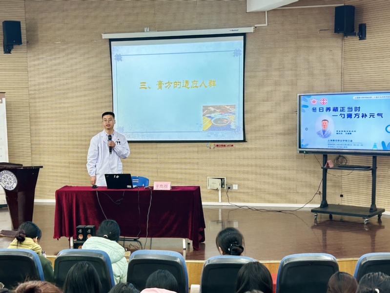 王高強副主任深耕中醫(yī)內(nèi)科臨床工作多年,在膏方調(diào)理與養(yǎng)生保健領(lǐng)域有著豐富的理論積淀和實踐經(jīng)驗。講座中,他結(jié)合中醫(yī)“天人相應(yīng)”和“冬藏”理論,從膏方的歷史淵源、組方原則、炮制工藝等核心內(nèi)容切入,系統(tǒng)講解了膏方在冬日養(yǎng)生中的獨特優(yōu)勢。講座內(nèi)容兼具理論深度與實踐價值,學生們專注聆聽、認真記錄,并就膏方制備流程、藥材炮制要點等專業(yè)問題與王主任探討交流。